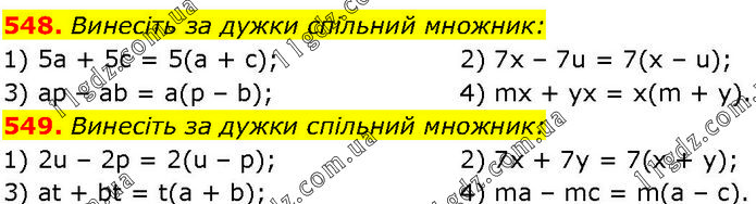 548. Винесіть за дужки спільний множник: 1) 5а + 5c = 5(а + c); 3) аp – аb = а(p – b); 2) 7x – 7u = 7(x – u); 4) mx + yx = х(m + y). 549. Винесіть за дужки спільний множник: 1) 2u – 2p = 2(u – p); 3) аt + bt = t(а + b); 2) 7x + 7y = 7(x + y); 4) ma – mc = m(a – c).