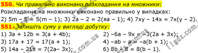 550. Чи правильно виконано розкладання на множники: Розкладання на множники виконано правильно у випадках: 2) 5m – 5 = 5(m – 1); 3) 2a – 2 = 2(яa – 1); 4) 7ху – 14х = 7х(у – 2). 551. Запишіть суму у вигляді добутку: 1) 3а + 12b = 3(а + 4b); 3) 17a + 17 = 17(а + 1); 5) 14а – 21х = 7(2а– 3х); 2) –6а – 9х = –3(2а + Зх); 4) –ab – а = –а(b + 1); 6) 8b – 8 = 8(b – 1).