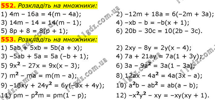 552. Розкладіть на множники: 1) 4m – 16а = 4(m – 4а); 3) 14m – 14 = 14(m – 1); 5) 8р + 8 = 8(р + 1); 2) –12m + 18а = 6(–2m + 3а); 4) –хb – b = –b(х + 1); 6) 20b – 30с = 10(2b – 3с). 553. Розкладіть на множники: 1) 5ab + 5xb = 5b(а + х); 3) –5ab + 5а = 5а (–b + 1); 5) 9х2 – 27х = 9х(х – 3); 7) m2 – mа = m(m – а); 9) –18хy + 24у2 = 6у(–3х + 4у); 11) рm – р2m = рm(1 – р); 2) 2ху – 8у = 2у(х – 4); 4) 7а + 21ау = 7а(1 + 3у); 6) За – 9а2 = 3а(1 – 3а); 8) 12ах – 4а2 = 4а(3х – а); 10) a2b – ab2 = ab(a – b); 12) –х2у2 – ху = –ху(ху + 1).