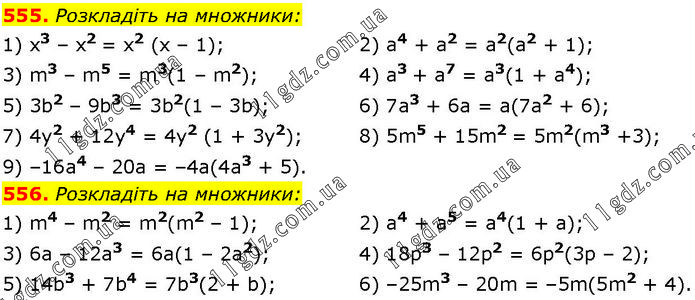 555. Розкладіть на множники: 1) х3 – х2 = х2 (х – 1); 3) m3 – m5 = m3(1 – m2); 5) 3b2 – 9b3 = 3b2(1 – 3b); 7) 4y2 + 12y4 = 4y2 (1 + 3y2); 9) –16а4 – 20а = –4а(4а3 + 5). 2) а4 + а2 = а2(а2 + 1); 4) а3 + а7 = а3(1 + а4); 6) 7а3 + 6а = а(7а2 + 6); 8) 5m5 + 15m2 = 5m2(m3 +3); 556. Розкладіть на множники: 1) m4 – m2 = m2(m2 – 1); 3) 6а – 12а3 = 6а(1 – 2а2); 5) 14b3 + 7b4 = 7b3(2 + b); 2) а4 + а5 = а4(1 + а); 4) 18р3 – 12р2 = 6р2(3р – 2); 6) –25m3 – 20m = –5m(5m2 + 4).