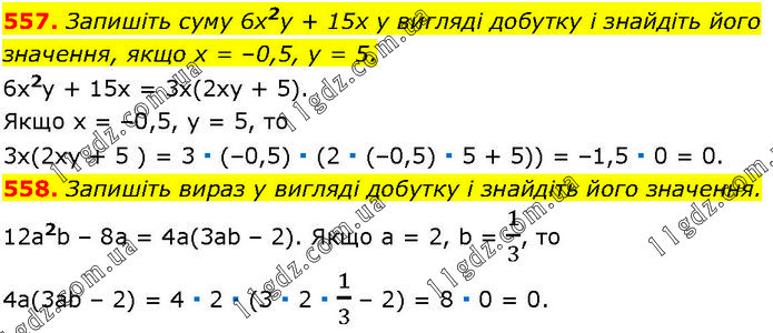557. Запишіть суму 6х2у + 15х у вигляді добутку і знайдіть його значення, якщо х = –0,5, у = 5. 6х2у + 15x = 3х(2ху + 5). Якщо х = –0,5, у = 5, то 3х(2ху + 5 ) = 3 ∙ (–0,5) ∙ (2 ∙ (–0,5) ∙ 5 + 5)) = –1,5 ∙ 0 = 0. 558. Запишіть вираз у вигляді добутку і знайдіть його значення. 12а2b – 8a = 4a(3ab – 2). Якщо а = 2, b = 1/3, то 4a(3ab – 2) = 4 ∙ 2 ∙ (3 ∙ 2 ∙ 1/3 – 2) = 8 ∙ 0 = 0.