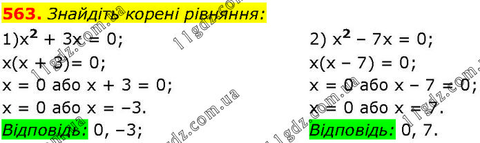 Знайдіть корені рівняння: 1)х2 + 3х = 0; х(х + 3)= 0; х = 0 або х + 3 = 0; х = 0 або х = –3. Відповідь: 0, –3; 2) х2 – 7x = 0; х(х – 7) = 0; х = 0 або х – 7 = 0; х = 0 або х = 7. Відповідь: 0,7.