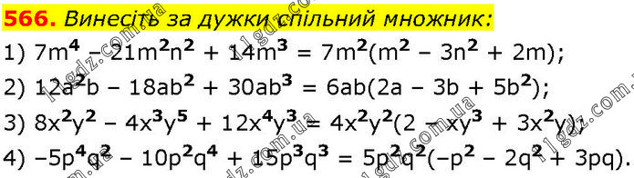 Винесіть за дужки спільний множник: 1) 7m4 – 21m2n2 + 14m3 = 7m2(m2 – 3n2 + 2m); 2) 12a2b – 18ab2 + 30ab3 = 6ab(2a – 3b + 5b2); 3) 8x2y2 – 4х3у5 + 12х4y3 = 4х2у2(2 – ху3 + 3х2у); 4) –5p4q2 – 10p2q4 + 15р3q3 = 5p2q2(–p2 – 2q2 + 3pq).