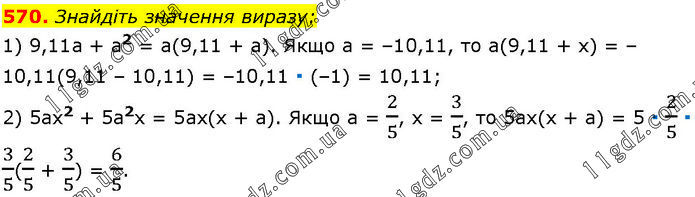 Знайдіть значення виразу: 1) 9,11a + a2 = a(9,11 + a). Якщо a = –10,11, то a(9,11 + x) = –10,11(9,11 – 10,11) = –10,11 ∙ (–1) = 10,11; 2) 5ax2 + 5a2x = 5ax(x + a). Якщо a = 2/5, x = 3/5, то 5ax(x + a) = 5 ∙ 2/5 ∙ 3/5(2/5 + 3/5) = 6/5.