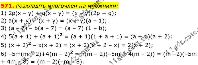 Розкладіть многочлен на множники: 1) 2р(х – у) + q(x – у) = (х – у)(2р + q); 2) а(х + у) – (х + у) = (х + у)(а – 1); 3) (a – 7) – b(a – 7) = (a – 7) (1 – b); 4) 5(а + 1) + (а + 1)2 = (a + 1)(1 + a + 1) = (a + 1)(а + 2); 5) (х + 2)2 – х(х + 2) = (х + 2)(х + 2 – х) = 2(х + 2); 6) –5m(m – 2)+4(m – 2)2 = m(m – 2)(–5m + 4(m – 2)) = (m –2)(–5m + 4m – 8) = (m – 2)(–m – 8).
