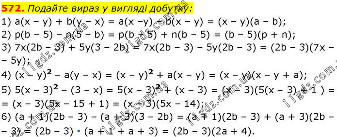 Подайте вираз у вигляді добутку: 1) a(x – у) + b(у – х) = а(х –у) – b(x – у) = (х – у)(а – b); 2) р(b – 5) – n(5 – b) = р(b – 5) + n(b – 5) = (b – 5)(р + n); 3) 7х(2b – 3) + 5у(3 – 2b) = 7х(2b – 3) – 5у(2b – 3) = (2b – 3)(7х – – 5y); 4) (х – у)2 – а(у – х) = (х – у)2 + а(х – у) = (х – у)(х – у + а); 5) 5(x – 3)2 – (3 – х) = 5(х – 3)2 + (х – 3) = (х – 3)(5(х – 3) + 1 ) = = (х – 3)(5х – 15 + 1) = (х – 3)(5х – 14); 6) (а + 1)(2b – 3) – (а + 3)(3 – 2b) = (а + 1)(2b – 3) + (а + 3)(2b – – 3) = (2b – 3) ∙ (а + 1 + a + 3) = (2b – 3)(2а + 4).