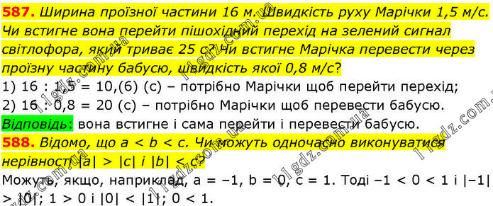 587. Ширина проїзної частини 16 м. Швидкість руху Марічки 1,5 м/с. Чи встигне вона перейти пішохідний перехід на зелений сигнал світлофора, який триває 25 с? Чи встигне Марічка перевести через проїзну частину бабусю, швидкість якої 0,8 м/с? 1) 16 : 1,5 = 10,(6) (с) – потрібно Марічки щоб перейти перехід; 2) 16 : 0,8 = 20 (с) – потрібно Марічки щоб перевести бабусю. Відповідь: вона встигне і сама перейти і перевести бабусю. 588. Відомо, що а < b < с. Чи можуть одночасно виконуватися нерівності |а| > |с| і |b| < c? Можуть, якщо, наприклад, а = –1, b = 0, с = 1. Тоді –1 < 0 < 1 і |–1| > |0|; 1 > 0 і |0| < |1|; 0 < 1.