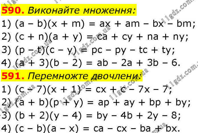 590. Виконайте множення: 1) (а – b)(х + m) = ах + am – bx – bm; 2) (с + n)(a + y) = сa + сy + na + ny; 3) (p – t)(c – у) = pc – pу – tc + ty; 4) (а + 3)(b – 2) = ab – 2а + 3b – 6. 591. Перемножте двочлени: 1) (с – 7)(x + 1) = cx + с – 7x – 7; 2) (a + b)(p + y) = ap + ay + bp + by; 3) (b + 2)(y – 4) = by – 4b + 2y – 8; 4) (c – b)(а – x) = ca – cx – bа + bx.
