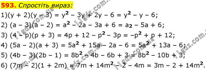 Спростіть вираз: 1)(у + 2)(у – 3) = у2 – 3у + 2у – 6 = у2 – у – 6; 2) (а – 3)(а – 2) = а2 – 2а – 3а + 6 = а2 – 5а + 6; 3) (4 – р)(р + 3) = 4р + 12 – р2 – 3р = –р2 + р + 12; 4) (5а – 2)(а + 3) = 5а2 + 15а – 2а – 6 = 5а2 + 13а – 6; 5) (4b – 3)(2b – 1) = 8b2 – 4b – 6b + 3 = 8b2 – 10b + 3; 6) (7m – 2)(1 + 2m) = 7m + 14m2 – 2 – 4m = 3m – 2 + 14m2.