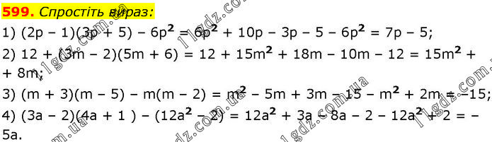 Спростіть вираз: 1) (2р – 1)(3р + 5) – 6р2 = 6р2 + 10p – 3р – 5 – 6р2 = 7p – 5; 2) 12 + (3m – 2)(5m + 6) = 12 + 15m2 + 18m – 10m – 12 = 15m2 + + 8m; 3) (m + 3)(m – 5) – m(m – 2) = m2 – 5m + 3m – 15 – m2 + 2m = –15; 4) (3а – 2)(4а + 1 ) – (12а2 – 2) = 12а2 + 3а – 8а – 2 – 12а2 + 2 = –5а.