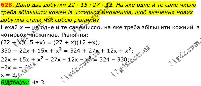 Дано два добутки 22 ∙ 15 і 27 ∙ 12. На яке одне й те саме число треба збільшити кожен із чотирьох множників, щоб значення нових добутків стали між собою рівними? Нехай х — це одне й те саме число, на яке треба збільшити кожний із чотирьох множників. Рівняння: (22 + х)(15 + х) = (27 + х)(12 + х); 330 + 22х + 15х + х2 = 324 + 27х + 12x + x2; 22х + 15х + х2 – 27х – 12х – х2 = 324 – 330; –2х = – 6; х = 3. Відповідь: На 3.