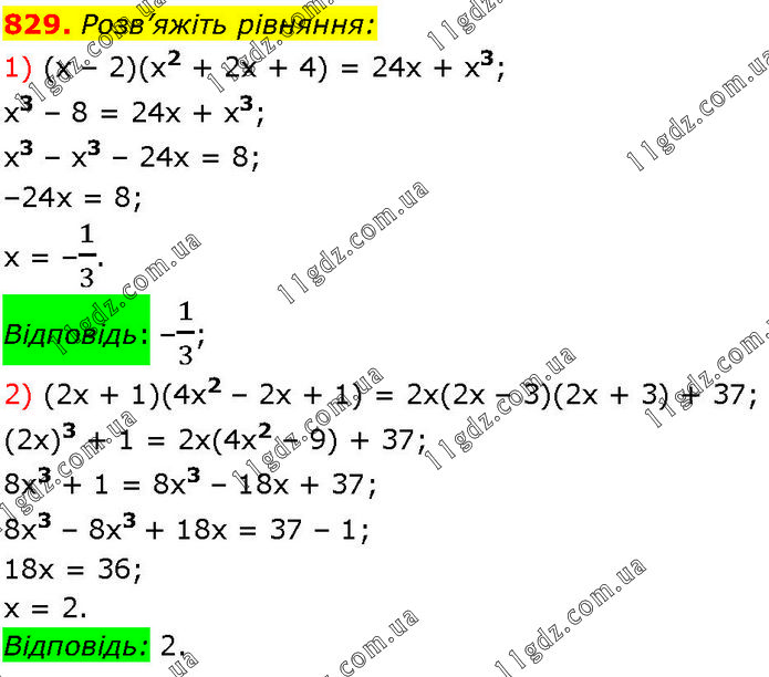 Розв’яжіть рівняння: 1) (х – 2)(х2 + 2х + 4) = 24х + x3; x3 – 8 = 24х + х3; х3 – х3 – 24х = 8; –24х = 8; x = –1/3. Відповідь: –1/3; 2) (2х + 1)(4х2 – 2х + 1) = 2х(2х – 3)(2х + 3) + 37; (2х)3 + 1 = 2х(4х2 – 9) + 37; 8x3 + 1 = 8x3 – 18x + 37; 8х3 – 8х3 + 18х = 37 – 1; 18x = 36; х = 2. Відповідь: 2.