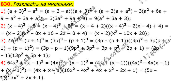 Розкладіть на множники: 1) (а + 3)3 – а3 = (а + 3 – а)((а + 3)2 + (а + 3)а + а2) – 3(а2 + 6а + 9 + а2 + 3а + а2) = 3(3а2 + 9а + 9) = 9(а2 + 3а + 3); 2) (х – 4)3 + 8 = (х – 4)3 + 23 = (х – 4 + 2)((х – 4)2 – 2(х – 4) + 4) = (х – 2)(х2 – 8х + 16 – 2х + 8 + 4) = (х – 2)(х2 – 10x + 28); 3) 27р3 – (р + 1)3 = (3р)3 – (р + 1)3 = (3р – (р + 1))((3р)2 + 3р(р + 1) + (р + 1)2) = (3р – р – 1)(9р2 + 3р2 + 3р + р2 + 2р + 1) = (2р – 1)(13р2 + 5р + 1); 4) 64x3 + (х – 1)3 = (4х)3 + (х – 1)3 = (4х + (х – 1))((4х)2 – 4х(х – 1) + (х – 1)2) = (4х + х – 1)(16х2 – 4х2 + 4х + x2 – 2х + 1) = (5х – 1)(13х2 + 2х + 1).