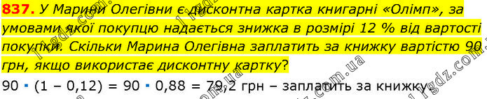 У Марини Олегівни є дисконтна картка книгарні «Олімп», за умовами якої покупцю надається знижка в розмірі 12 % від вартості покупки. Скільки Марина Олегівна заплатить за книжку вартістю 90 грн, якщо використає дисконтну картку? 90 ∙ (1 – 0,12) = 90 ∙ 0,88 = 79,2 грн – заплатить за книжку.