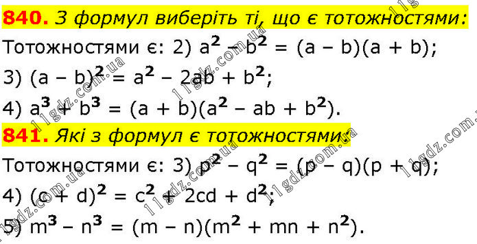 840. З формул виберіть ті, що є тотожностями: Тотожностями є: 2) а2 – b2 = (а – b)(a + b); 3) (а – b)2 = а2 – 2ab + b2; 4) а3 + b3 = (а + b)(a2 – ab + b2). 841. Які з формул є тотожностями: Тотожностями є: 3) р2 – q2 = (р – q)(p + q); 4) (c + d)2 = с2 + 2cd + d2; 5) m3 – n3 = (m – n)(m2 + mn + n2).