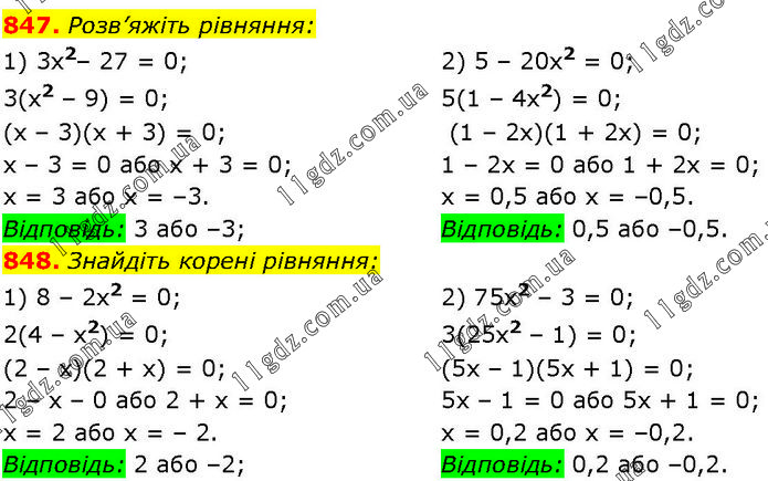 847. Розв’яжіть рівняння: 1) 3x2– 27 = 0; 3(x2 – 9) = 0; (x – 3)(x + 3) = 0; x – 3 = 0 або x + 3 = 0; x = 3 або x = –3. Відповідь: 3 або –3; 2) 5 – 20x2 = 0; 5(1 – 4x2) = 0; (1 – 2x)(1 + 2x) = 0; 1 – 2x = 0 або 1 + 2x = 0; x = 0,5 або x = –0,5. Відповідь: 0,5 або –0,5. 848. Знайдіть корені рівняння: 1) 8 – 2x2 = 0; 2(4 – x2) = 0; (2 – х)(2 + х) = 0; 2 – х – 0 або 2 + х = 0; х = 2 або х = – 2. Відповідь: 2 або –2; 2) 75x2 – 3 = 0; 3(25x2 – 1) = 0; (5х – 1)(5х + 1) = 0; 5х – 1 = 0 або 5x + 1 = 0; х = 0,2 або х = –0,2. Відповідь: 0,2 або –0,2.