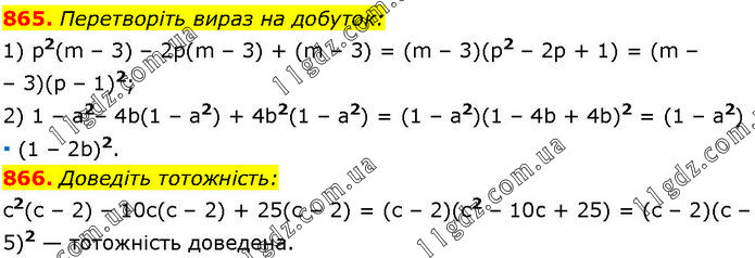 865. Перетворіть вираз на добуток: 1) р2(m – 3) – 2р(m – 3) + (m – 3) = (m – 3)(р2 – 2р + 1) = (m – 3)(р – 1)2; 2) 1 – а2– 4b(1 – а2) + 4b2(1 – а2) = (1 – a2)(1 – 4b + 4b)2 = (1 – а2) ∙ (1 – 2b)2. 866. Доведіть тотожність: с2(с – 2) – 10с(с – 2) + 25(с – 2) = (с – 2)(с2 – 10c + 25) = (с – 2)(с – 5)2 — тотожність доведена.
