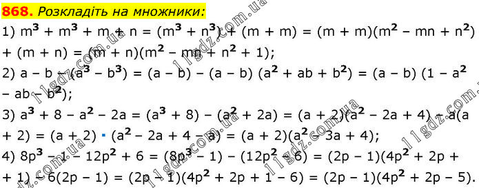 Розкладіть на множники: 1) m3 + m3 + m + n = (m3 + n3) + (m + m) = (m + m)(m2 – mn + n2) + (m + n) = (m + n)(m2 – mn + n2 + 1); 2) a – b – (a3 – b3) = (a – b) – (a – b) (a2 + ab + b2) = (a – b) (1 – a2 – ab – b2); 3) а3 + 8 – а2 – 2а = (а3 + 8) – (а2 + 2а) = (а + 2)(а2 – 2а + 4) – а(а + 2) = (а + 2) ∙ (а2 – 2а + 4 – а) = (а + 2)(а2 – 3а + 4); 4) 8р3 – 1 – 12р2 + 6 = (8р3 – 1) – (12р2 – 6) = (2р – 1)(4р2 + 2р + 1) – 6(2р – 1) = (2р – 1)(4р2 + 2р + 1 – 6) = (2р – 1)(4р2 + 2р – 5).