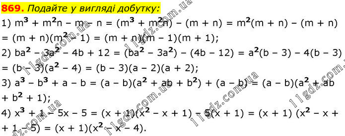 Подайте у вигляді добутку: 1) m3 + m2n – m – n = (m3 + m2n) – (m + n) = m2(m + n) – (m + n) = (m + n)(m2 – 1) = (m + n)(m – 1)(m + 1); 2) ba2 – 3a2 – 4b + 12 = (ba2 – 3a2) – (4b – 12) = a2(b – 3) – 4(b – 3) = (b – 3)(a2 – 4) = (b – 3)(a – 2)(a + 2); 3) a3 – b3 + a – b = (a – b)(a2 + ab + b2) + (a – b) = (a – b)(a2 + ab + b2 + 1); 4) x3 + 1 – 5x – 5 = (x + 1)(x2 – x + 1) – 5(x + 1) = (x + 1) (x2 – x + 1 – 5) = (x + 1)(x2 – x – 4).