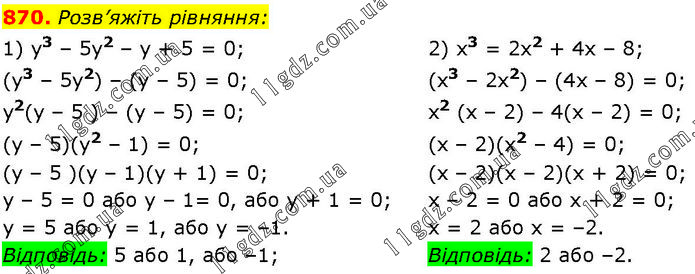 Розв’яжіть рівняння: 1) y3 – 5y2 – y + 5 = 0; (у3 – 5у2) – (у – 5) = 0; y2(y – 5 ) – (y – 5) = 0; (y – 5)(y2 – 1) = 0; (y – 5 )(y – 1)(y + 1) = 0; y – 5 = 0 або у – 1= 0, або y + 1 = 0; y = 5 або y = 1, або y = –1. Відповідь: 5 або 1, або –1; 2) x3 = 2x2 + 4x – 8; (x3 – 2x2) – (4x – 8) = 0; x2 (x – 2) – 4(x – 2) = 0; (x – 2)(x2 – 4) = 0; (x – 2)(x – 2)(x + 2) = 0; x – 2 = 0 або x + 2 = 0; х = 2 або х = –2. Відповідь: 2 або –2.