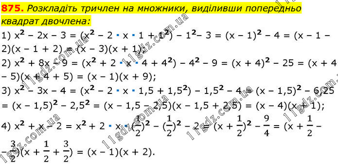 Розкладіть тричлен на множники, виділивши попередньо квадрат двочлена: 1) x2 – 2х – 3 = (х2 – 2 ∙ х ∙ 1 + 12) – 12– 3 = (х – 1)2 – 4 = (х – 1 – 2)(х – 1 + 2) = (х – 3)(х + 1); 2) x2 + 8х – 9 = (х2 + 2 ∙ х ∙ 4 + 42) – 42 – 9 = (х + 4)2 – 25 = (х + 4 – 5)(х + 4 + 5) = (х – 1)(х + 9); 3) x2 – 3х – 4 = (х2 – 2 ∙ х ∙ 1,5 + 1,52) – 1,52 – 4 = (х – 1,5)2 – 6,25 = (х – 1,5)2 – 2,52 = (х – 1,5 – 2,5)(х – 1,5 + 2,5) = (х – 4)(х + 1); 4) x2 + x – 2 = x2 + 2 ∙ x ∙ (1/2)2 – (1/2)2 – 2 = (x + 1/2)2 – 9/4 = (x + 1/2 – 3/2)(x + 1/2 + 3/2) = (x – 1)(x + 2).