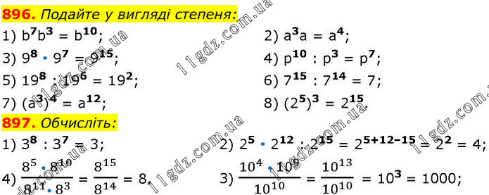 896. Подайте у вигляді степеня: 1) b7b3 = b10; 3) 98 ∙ 97 = 915; 5) 198 : 196 = 192; 7) (a3)4 = a12; 2) а3а = а4; 4) р10 : р3 = р7; 6) 715 : 714 = 7; 8) (25)3 = 215. 897. Обчисліть: 1) З8 : З7 = 3; 4) (8^5 • 8^10)/(8^11• 8^3 ) = 8^15/8^14 = 8. 2) 25 ∙ 212 : 215 = 25+12–15 = 22 = 4; 3) (10^4 • 10^9)/10^10 = 10^13/10^10 = 103 = 1000;