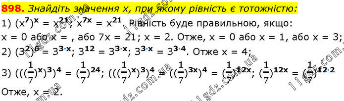 Знайдіть значення х, при якому рівність є тотожністю: 1) (x7)x = x21; x7x = x21. Рівність буде правильною, якщо: х = 0 або х = , або 7х = 21; х = 2. Отже, х = 0 або х = 1, або х = 3; 2) (З2)6 = З3∙x; З12 = З3∙x; З3∙x = З3∙4. Отже х = 4; 3) (((1/7)x)3)4 = (1/7)24; (((1/7)x)3)4 = ((1/7)3x)4 = (1/7)12x; (1/7)12x = (1/7)12∙2 Отже, х = 2.