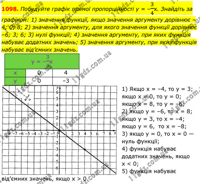 Побудуйте графік прямої пропорційності у = –3/4x. Знайдіть за графіком: 1) значення функції, якщо значення аргументу дорівнює –4; 0; 8; 2) значення аргументу, для якого значення функції дорівнює –6; 3; 6; 3) нулі функції; 4) значення аргументу, при яких функція набуває додатних значень; 5) значення аргументу, при яких функція набуває від’ємних значень. 1) Якщо х = –4, то у = 3; якщо х = 0, то у = 0; якщо х = 8, то у = –6; 2) якщо у = –6, то x = 8; якщо у = З, то х = –4; якщо у = 6, то х = –8; 3) якщо у = 0, то х = 0 — нуль функції; 4) функція набуває додатних значень, якщо х < 0; 5) функція набуває від’ємних значень, якщо х > 0.