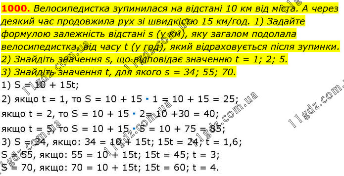 Велосипедистка зупинилася на відстані 10 км від міста. А через деякий час продовжила рух зі швидкістю 15 км/год. 1) Задайте формулою залежність відстані s (у км), яку загалом подолала велосипедистка, від часу t (у год), який відраховується після зупинки. 2) Знайдіть значення s, що відповідає значенню t = 1; 2; 5. 3) Знайдіть значення t, для якого s = 34; 55; 70. 1) S = 10 + 15t; 2) якщо t = 1, то S = 10 + 15 ∙ 1 = 10 + 15 = 25; якщо t = 2, то S = 10 + 15 ∙ 2= 10 +30 = 40; якщо t = 5, то S = 10 + 15 ∙ 5 = 10 + 75 = 85; 3) S = 34, якщо: 34 = 10 + 15t; 15t = 24; t = 1,6; S = 55, якщо: 55 = 10 + 15t; 15t = 45; t = 3; S = 70, якщо: 70 = 10 + 15t; 15t = 60; t = 4.