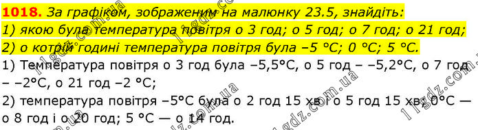 За графіком, зображеним на малюнку 23.5, знайдіть: 1) якою була температура повітря о 3 год; о 5 год; о 7 год; о 21 год; 2) о котрій годині температура повітря була –5 °С; 0 °С; 5 °С. 1) Температура повітря о 3 год була –5,5°С, о 5 год – –5,2°С, о 7 год – –2°С, о 21 год –2 °С; 2) температура повітря –5°С була о 2 год 15 хв і о 5 год 15 хв; 0°С — о 8 год і о 20 год; 5 °С — о 14 год.