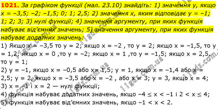 За графіком функції (мал. 23.10) знайдіть: 1) значення у, якщо х = –3,5; –2; –1,5; 0; 1; 2,5; 2) значення х, яким відповідає у = –1; 1; 2; 3; 3) нулі функції; 4) значення аргументу, при яких функція набуває від’ємних значень; 5) значення аргументу, при яких функція набуває додатних значень. 1) Якщо х = –3,5 то у = 2; якщо х = –2 , то у = 2; якщо х = –1,5, то у = 1,2; якщо х = 0 ,то у = –2; якщо х = 1 ,то у = –1,5; якщо х = 2,5, то у = 1; 2) у = –1, якщо х = –0,5 або х= 1,5; у = 1, якщо х = –1,4 або х = 2,5; у = 2, якщо х = –3,5 або х = –2 , або х = 3; у = 3, якщо х = 4; 3) х = –1 і х = 2 — нулі функції; 4) функція набуває додатних значень, якщо –4 ≤ х < –1 і 2 < х ≤ 4; 5) функція набуває від’ємних значень, якщо –1 < х < 2.