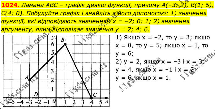Ламана ABC – графік деякої функції, причому А(–3; 2), B(1; 6), С(4; 0). Побудуйте графік і знайдіть з його допомогою: 1) значення функції, які відповідають значенням х = –2; 0; 1; 2) значення аргументу, яким відповідає значення у = 2; 4; 6. 1) Якщо х = –2, то у = 3; якщо x = 0, тo y = 5; якщо х = 1, то у = 6; 2) у = 2, якщо x = –3 і х = 3; у = 4, якщо x = –1 і х = 2; у = 6, якщо х = 1.