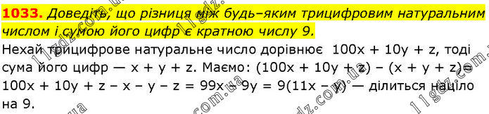 Доведіть, що різниця між будь–яким трицифровим натуральним числом і сумою його цифр є кратною числу 9. Нехай трицифрове натуральне число дорівнює 100x + 10y + z, тоді сума його цифр — x + y + z. Маємо: (100x + 10y + z) – (x + y + z) = 100x + 10y + z – x – y – z = 99х – 9у = 9(11x – у) — ділиться націло на 9.