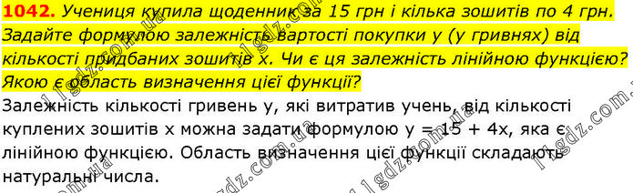 Учениця купила щоденник за 15 грн і кілька зошитів по 4 грн. Задайте формулою залежність вартості покупки у (у гривнях) від кількості придбаних зошитів х. Чи є ця залежність лінійною функцією? Якою є область визначення цієї функції? Залежність кількості гривень у, які витратив учень, від кількості куплених зошитів х можна задати формулою у = 15 + 4х, яка є лінійною функцією. Область визначення цієї функції складають натуральні числа.