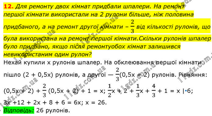 Для ремонту двох кімнат придбали шпалери. На ремонт першої кімнати використали на 2 рулони більше, ніж половина придбаного, а на ремонт другої кімнати – 2/3 від кількості рулонів, що була використана на ремонт першої кімнати.Скільки рулонів шпалер було придбано, якщо після ремонтуобох кімнат залишився невикористаним один рулон? Нехай купили х рулонів шпалер. На обклеювання першої кімнати пішло (2 + 0,5х) рулонів, а другої — 2/3(0,5x + 2) рулонів. Рівняння: (0,5х + 2) + 2/3 (0,5х + 2) + 1 = х; 1/2х + 2 + 1/3х + 4/3 + 1 = х |∙6; Зх +12 + 2х + 8 + 6 = 6х; х = 26. Відповідь: 26 рулонів.