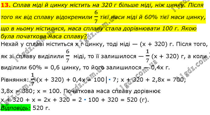 Сплав міді й цинку містить на 320 г більше міді, ніж цинку. Після того як від сплаву відокремили 6/7 тієї маси міді й 60% тієї маси цинку, що в ньому містилися, маса сплаву стала дорівнювати 100 г. Якою була початкова маса сплаву? Нехай у сплаві міститься х г цинку, тоді міді — (х + 320) г. Після того, як зі сплаву виділили 6/7 міді, то її залишилося — 1/7 (х + 320) г, а коли виділили 60% = 0,6 цинку, то його залишилося — 0,4х г. Рівняння: 1/7 (х + 320) + 0,4х = 100│∙ 7; х + 320 + 2,8х = 700; 3,8х = 380; х = 100. Початкова маса сплаву дорівнює х + 320 + х = 2х + 320 = 2 ∙ 100 + 320 = 520 (г). Відповідь: 520 г.