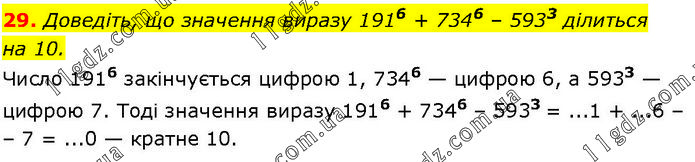 Доведіть, що значення виразу 1916 + 7346 – 5933 ділиться на 10. Число 1916 закінчується цифрою 1, 7346 — цифрою 6, а 5933 — цифрою 7. Тоді значення виразу 1916 + 7346 – 5933 = ...1 + ...6 – – 7 = ...0 — кратне 10.