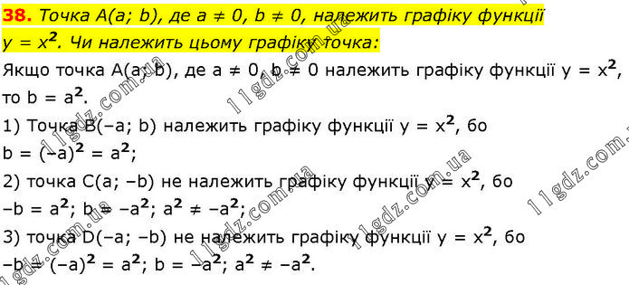Точка А(а; b), де а ≠ 0, b ≠ 0, належить графіку функції у = х2. Чи належить цьому графіку точка: Якщо точка А(а; b), де а ≠ 0, b ≠ 0 належить графіку функції у = х2, то b = a2. 1) Точка В(–а; b) належить графіку функції у = х2, бо b = (–а)2 = а2; 2) точка С(a; –b) не належить графіку функції у = х2, бо –b = а2; b = –а2; а2 ≠ –а2; 3) точка D(–a; –b) не належить графіку функції у = х2, бо –b = (–а)2 = а2; b = –а2; а2 ≠ –а2.