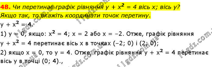 Чи перетинає графік рівняння у + x2 = 4 вісь х; вісь у? Якщо так, то вкажіть координати точок перетину. у + x2 = 4. 1) у = 0, якщо: x2 = 4; х = 2 або х = –2. Отже, графік рівняння у + x2 = 4 перетинає вісь х в точках (–2; 0) і (2; 0); 2) якщо х = 0, то у = 4. Отже, графік рівняння у + x2 = 4 перетинає вісь у в точці (0; 4).
