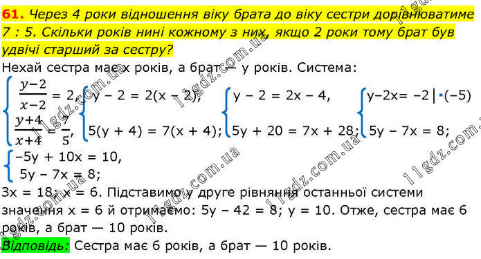 Через 4 роки відношення віку брата до віку сестри дорівнюватиме 7 : 5. Скільки років нині кожному з них, якщо 2 роки тому брат був удвічі старший за сестру? Нехай сестра має х років, а брат — у років. Система: (y-2)/(x-2) = 2, y – 2 = 2(x – 2), y – 2 = 2x – 4, y–2x= –2│∙(–5) (y+4)/(x+4) = 7/5, 5(y + 4) = 7(x + 4); 5y + 20 = 7x + 28; 5y – 7x = 8; –5y + 10x = 10, 5y – 7x = 8; Зх = 18; х = 6. Підставимо у друге рівняння останньої системи значення х = 6 й отримаємо: 5y – 42 = 8; у = 10. Отже, сестра має 6 років, а брат — 10 років. Відповідь: Сестра має 6 років, а брат — 10 років.