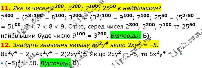 11. Яке із чисел 2300; З200; 7100; 2550 є найбільшим? 2300 = (23)100 = 8100; 3200 = (32)100 = 9100; 7100; 2550 = (52)50 = = 5100; 5 < 7 < 8 < 9. Отже, серед чисел 2300, 3200, 7100 та 2550 найбільшим буде число 9100 = 3200. Відповідь: Б). 12. Знайдіть значення виразу 8х2у4 якщо 2ху2 = –5. 8х2у4 = 2 ∙ 4х2у4 = 2(2ху2)2. Якщо 2ху2 = –5, то 8х2у4 = 2 ∙ ∙ (–5)2 = 50. Відповідь: В).
