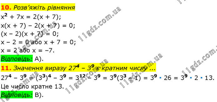 10. Розв’яжіть рівняння x2 + 7х = 2(х + 7); х(х + 7) – 2(х + 7) = 0; (х – 2)(х + 7) = 0; х – 2 = 0 або х + 7 = 0; х = 2 або х = –7. Відповідь: А). 11. Значення виразу 274 – З9 є кратним числу ... 274 – 39 = (33)4 – 39 = 312 – 39 = 39(33 – 1) = 39 ∙ 26 = 39 ∙ 2 ∙ 13. Це число кратне 13. Відповідь: В).