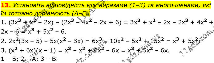 Установіть відповідність між виразами (1–3) та многочленами, які їм тотожно дорівнюють (А–Г). 1. (Зх3 + х2 – 2х) – (2х3 – 4х2 – 2х + 6) = Зх3 + х2 – 2х – 2х3 + 4х2 + 2х – 6 = х3 + 5х2 – 6. 2. 2х2(3х – 5) – 5х(х2 – Зх) = 6х3 – 10х2 – 5х3 + 15х2 = х3 + 5х2; 3. (х2 + 6х)(х – 1) = х3 – х2 + 6х2 – 6х = х3 + 5х2 – 6х. 1 – Б; 2 – А; 3 – В.