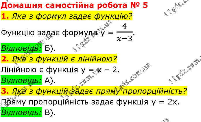 Домашня самостійна робота № 5 1. Яка з формул задає функцію? Функцію задає формула у = 4/(x-3). Відповідь: Б). 2. Яка з функцій є лінійною? Лінійною є функція у = х – 2. Відповідь: А). 3. Яка з функцій задає пряму пропорційність? Пряму пропорційність задає функція y = 2х. Відповідь: В).