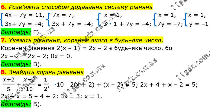 6. Розв’яжіть способом додавання систему рівнянь 4x – 7y = 11, 7x = 7, x = 1, x = 1, x = 1, 3х+ 7у = –4; Зх + 7у = –4; 3 ∙ 1 + 7у = –4; 7y = –7; у = –1 Відповідь: Г). 7. Укажіть рівняння, коренем якого є будь–яке число. Коренем рівняння 2(х – 1) = 2х – 2 є будь–яке число, бо 2х – 2 = 2х – 2; 0x = 0. Відповідь: В). 8. Знайдіть корінь рівняння (x+2)/5 + (x-2)/10 = 1/2;│∙10 2(х + 2) + (х – 2) = 5; 2х + 4 + х – 2 = 5; 2х + х = 5 – 4 + 2; 3х = 3; х = 1. Відповідь: Б).