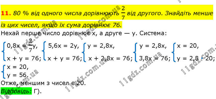 80 % від одного числа дорівнюють 2/7 від другого. Знайдіть менше із цих чисел, якщо їх сума дорівнює 76. Нехай перше число дорівнює х, а друге — у. Система: 0,8x = 2/7y, 5,6x = 2y, y = 2,8x, y = 2,8x, x = 20, x + y = 76; x + y = 76; x + 2,8x = 76; 3,8x = 76; y = 2,8 ∙ 20; x = 20, y = 56. Отже, меншим з чисел є 20. Відповідь: Г).