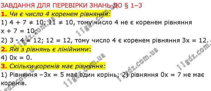 ЗАВДАННЯ ДЛЯ ПЕРЕВІРКИ ЗНАНЬ ДО § 1–3 1. Чи є число 4 коренем рівняння: 1) 4 + 7 ≠ 10; 11 ≠ 10, тому число 4 не є коренем рівняння х + 7 = 10; 2) 3 ∙ 4 = 12; 12 = 12, тому число 4 є коренем рівняння Зх = 12. 2. Які з рівнянь є лінійними: 4) 0х = 0. 3. Скільки коренів має рівняння: 1) Рівняння –3х = 5 має один корінь; 2) рівняння 0x = 7 не має коренів.