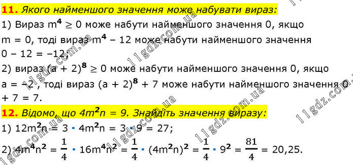 11. Якого найменшого значення може набувати вираз: 1) Вираз m4 ≥ 0 може набути найменшого значення 0, якщо m = 0, тоді вираз m4 – 12 може набути найменшого значення 0 – 12 = –12; 2) вираз (а + 2)8 ≥ 0 може набути найменшого значення 0, якщо а = –2 , тоді вираз (а + 2)8 + 7 може набути найменшого значення 0 + 7 = 7. 12. Відомо, що 4m2n = 9. Знайдіть значення виразу: 1) 12m2n = 3 ∙ 4m2n = 3 ∙ 9 = 27; 2) 4m4n2 = 1/4 ∙ 16m4n2 = 1/4 ∙ (4m2n)2 = 1/4 ∙ 92 = 81/4 = 20,25.