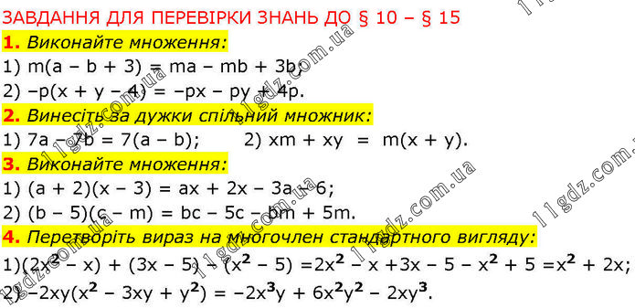 ЗАВДАННЯ ДЛЯ ПЕРЕВІРКИ ЗНАНЬ ДО § 10 – § 15 1. Виконайте множення: 1) m(а – b + 3) = mа – mb + 3b; 2) –р(х + у – 4) = –рх – ру + 4р. 2. Винесіть за дужки спільний множник: 1) 7а – 7b = 7(а – b); 2) хm + xу = m(х + у). 3. Виконайте множення: 1) (а + 2)(х – 3) = ах + 2х – 3а – 6; 2) (b – 5)(с – m) = bc – 5c – bm + 5m. 4. Перетворіть вираз на многочлен стандартного вигляду: 1)(2х2 – х) + (3х – 5) – (х2 – 5) =2х2 – х +3х – 5 – х2 + 5 =х2 + 2х; 2) –2xy(x2 – 3ху + у2) = –2х3у + 6х2y2 – 2ху3.