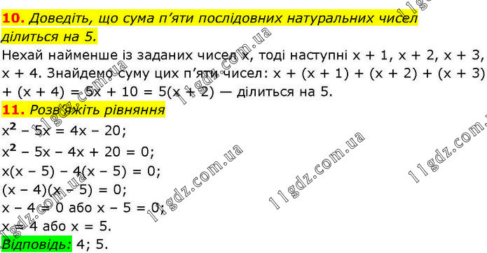 10. Доведіть, що сума п’яти послідовних натуральних чисел ділиться на 5. Нехай найменше із заданих чисел х, тоді наступні х + 1, х + 2, х + 3, х + 4. Знайдемо суму цих п’яти чисел: х + (х + 1) + (х + 2) + (х + 3) + (х + 4) = 5х + 10 = 5(х + 2) — ділиться на 5. 11. Розв’яжіть рівняння x2 – 5х = 4х – 20; x2 – 5х – 4х + 20 = 0; х(х – 5) – 4(х – 5) = 0; (х – 4)(х – 5) = 0; х – 4 = 0 або х – 5 = 0; х = 4 або х = 5. Відповідь: 4; 5.